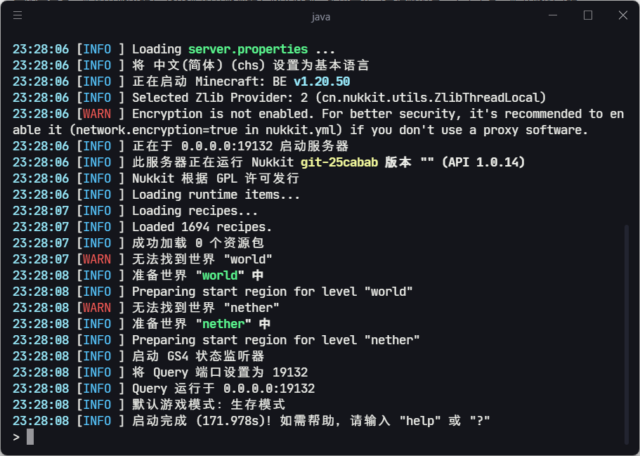 出现下面这个界面就代表你的服务端已经正式启动了,连上对应的端口就能开始游戏了